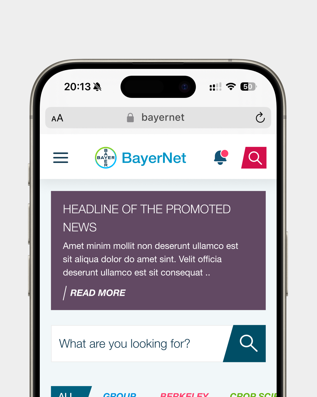 Das BayerNet ist die zentrale Plattform für mehr als 90.000 Mitarbeitende weltweit: News, Services und Tools vereinen individuelle Bedürfnisse mit den Botschaften von Bayer.